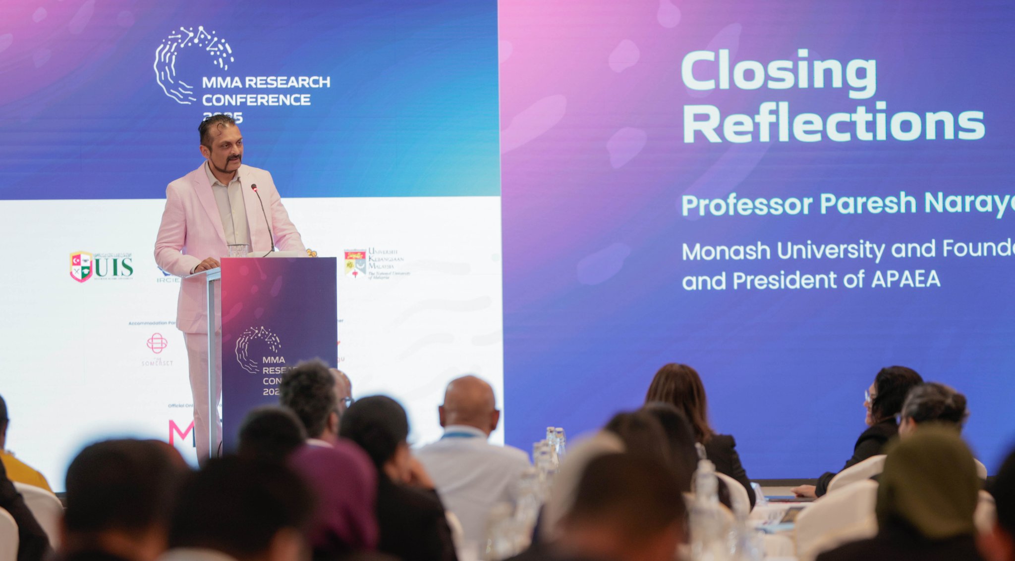 As the MMA–APAEA Joint Research Workshop draws to a close, Idham Hussain, Head of the MMA Institute for Research and Training, delivers a heartfelt Vote of Thanks, acknowledging the contributions of keynote speakers, panelists, moderators, partner institutions and participants. His remarks highlight the strength of the partnerships built through the conference between Maldives and international academia, between the public and private sectors, and between finance professionals and climate experts. Professor Paresh Narayan offers the Closing Reflection, distilling the main takeaways from the workshop and encouraging continued collaboration, new research questions and practical policy experiments that can be tested and refined in the years ahead.