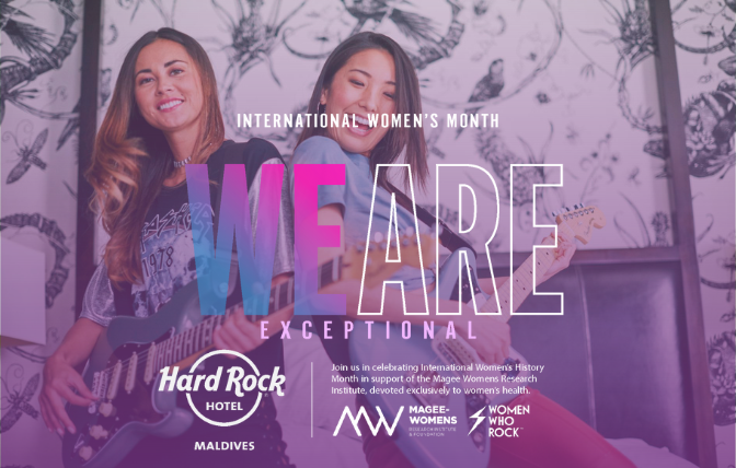 To celebrate International Women’s Month, Hard Rock Hotel Maldives is  joining Hard Rock International for its “WE ARE” initiative honoring its ongoing commitment to  championing women’s health and empowerment. Through its charitable arm, Hard Rock Heals  Foundation®, the company is raising funds throughout the month, benefitting two organizations  working to support women and women’s health: Global Gift Foundation and Magee-Women’s Research  Institute, through nearly 1,000 woman-led performances at locations around the world, food &  beverage offerings, in-room music experiences and more for guests to participate in.