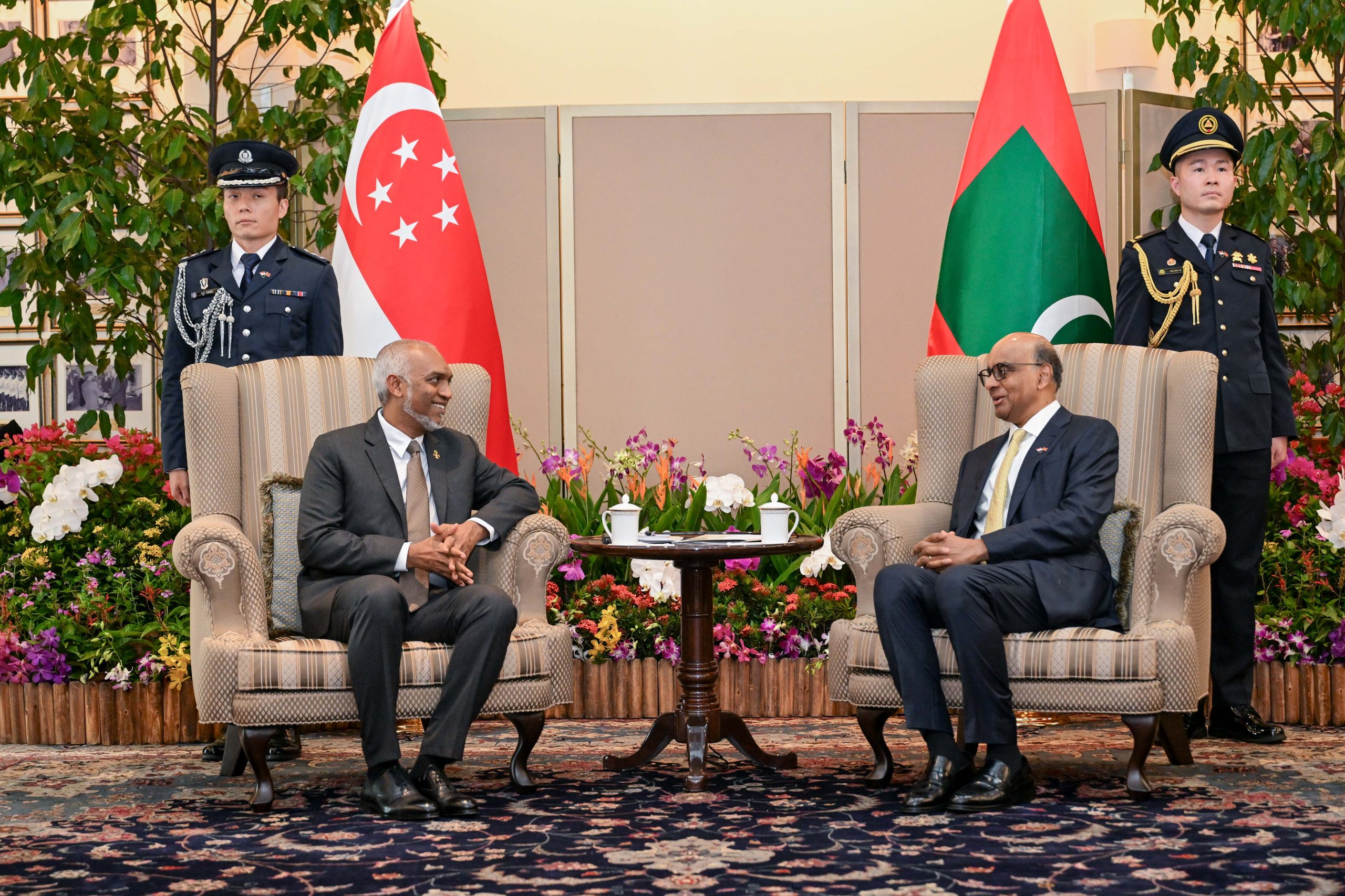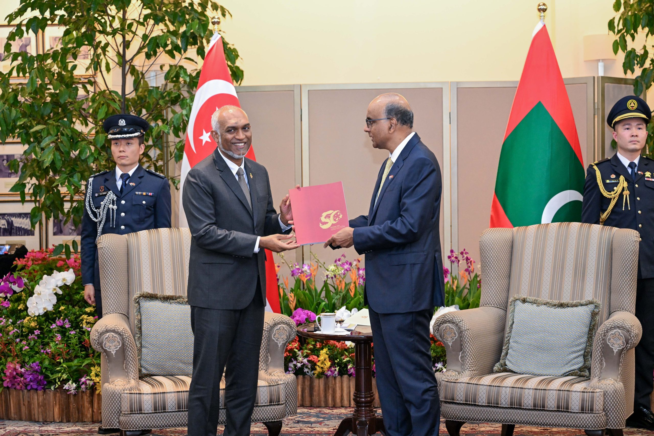 As part of his official state visit to Singapore, His Excellency President Dr Mohamed Muizzu paid a courtesy call this afternoon on His Excellency Tharman Shanmugaratnam, President of the Republic of Singapore. The high-level meeting took place amid commemorations of 50 years of diplomatic relations between the Maldives and Singapore, an enduring partnership that began on 20 February 1975.