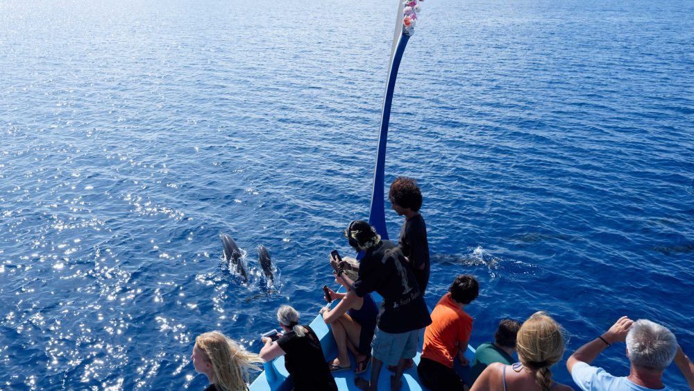 These dolphin tours are far more than a casual outing; they form a core part of the resort’s guest experience. Each cruise is carefully scheduled for morning and sunset hours, allowing guests to witness the dolphins at their most active. Trained local guides accompany every tour, enriching the journey with fascinating insights into dolphin behaviour, marine biodiversity, and the ecological importance of protecting these intelligent creatures. With the waters around Canareef teeming with pods of spinner dolphins, the tours offer frequent sightings of dolphins leaping, spinning, and riding the waves alongside the boat often just a few feet away from guests.